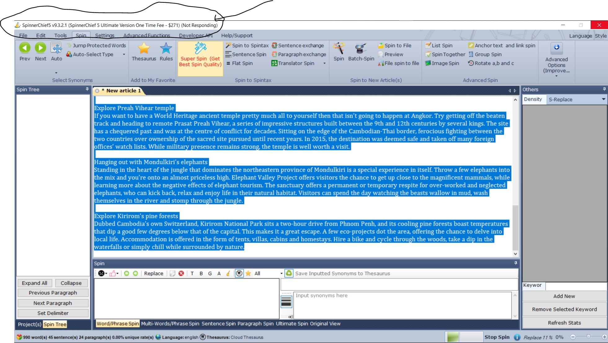 Hello,I tested SpinnerChief 5 with an article from the internet, it was stuck, appearing WINDOWS NOT RESPONDING. I cannot use the software now as it always likes that....
