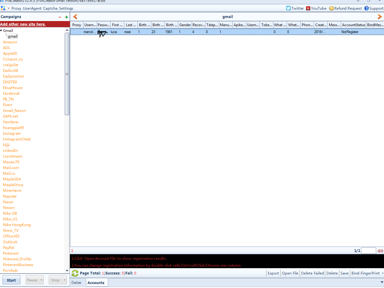 I put all the parameters but it always gives me an error when creating gmail accounts, even using only one username and password. can I have a working configuration? being useless I would like to request a refund. thank you