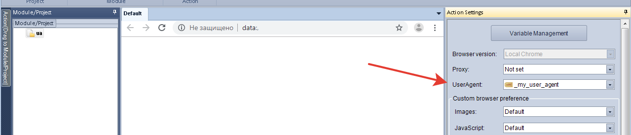 Using the chrome engine, you cannot change the user agent while the module is already running. You can change it only when the module starts.