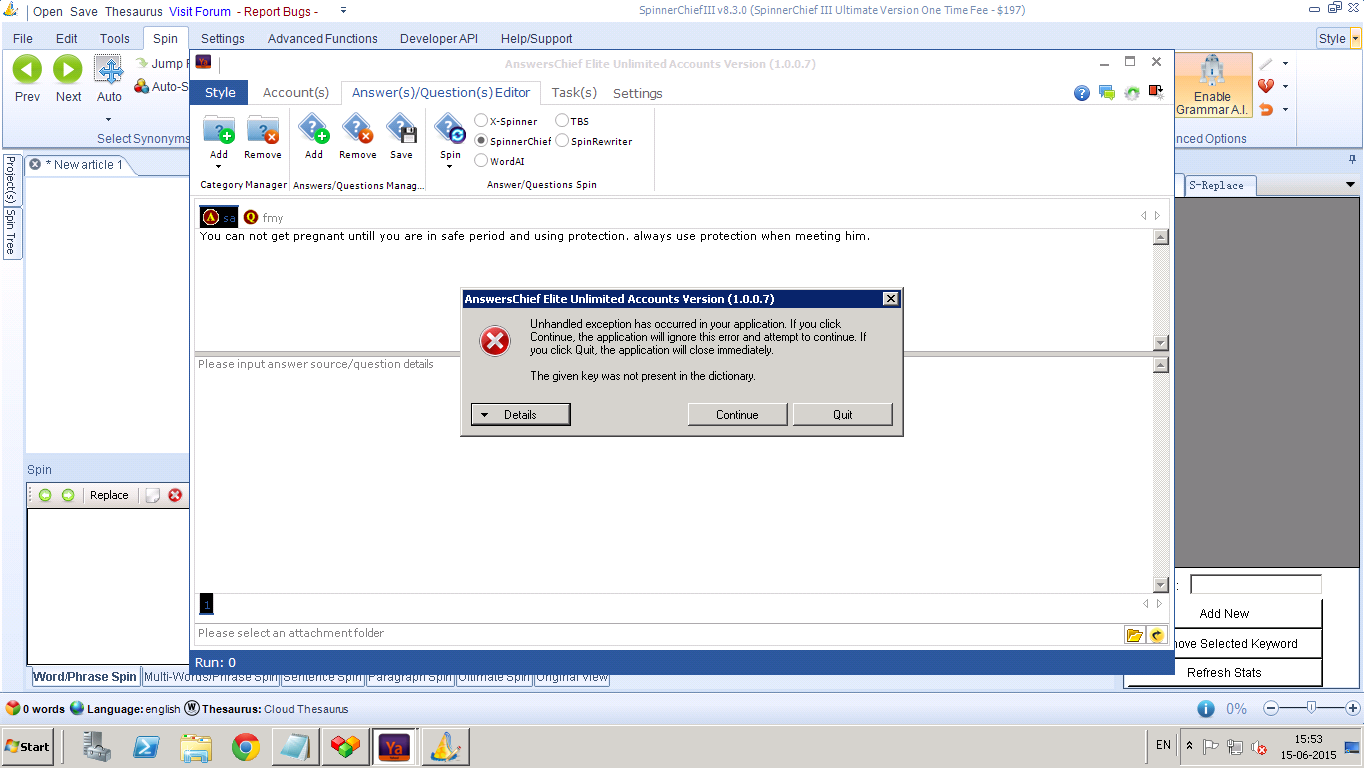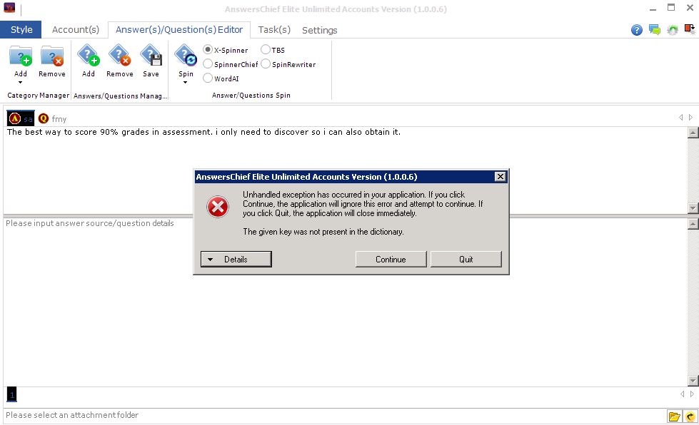 Hi, if you select x-spinner to spin, you need run x-spinner on your pc first, if you select spinnerchief to spin, you need input the spinnerchief api account in the software first.
