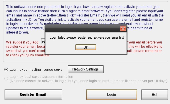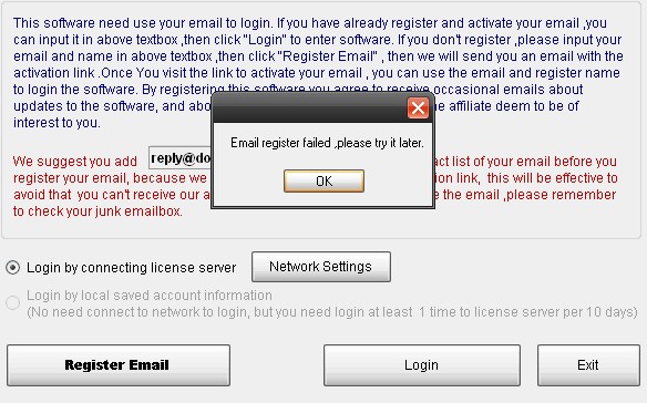 I have downloadedspinnerchief 4 & try free version. When I run spinnerchief its showing aemail login dialog box. I fill my name and email address and then click theregister email button. Its showing the error “ Email register failed, please tryit later”. And try to login its showing “login failed please register andactivate your email first”.