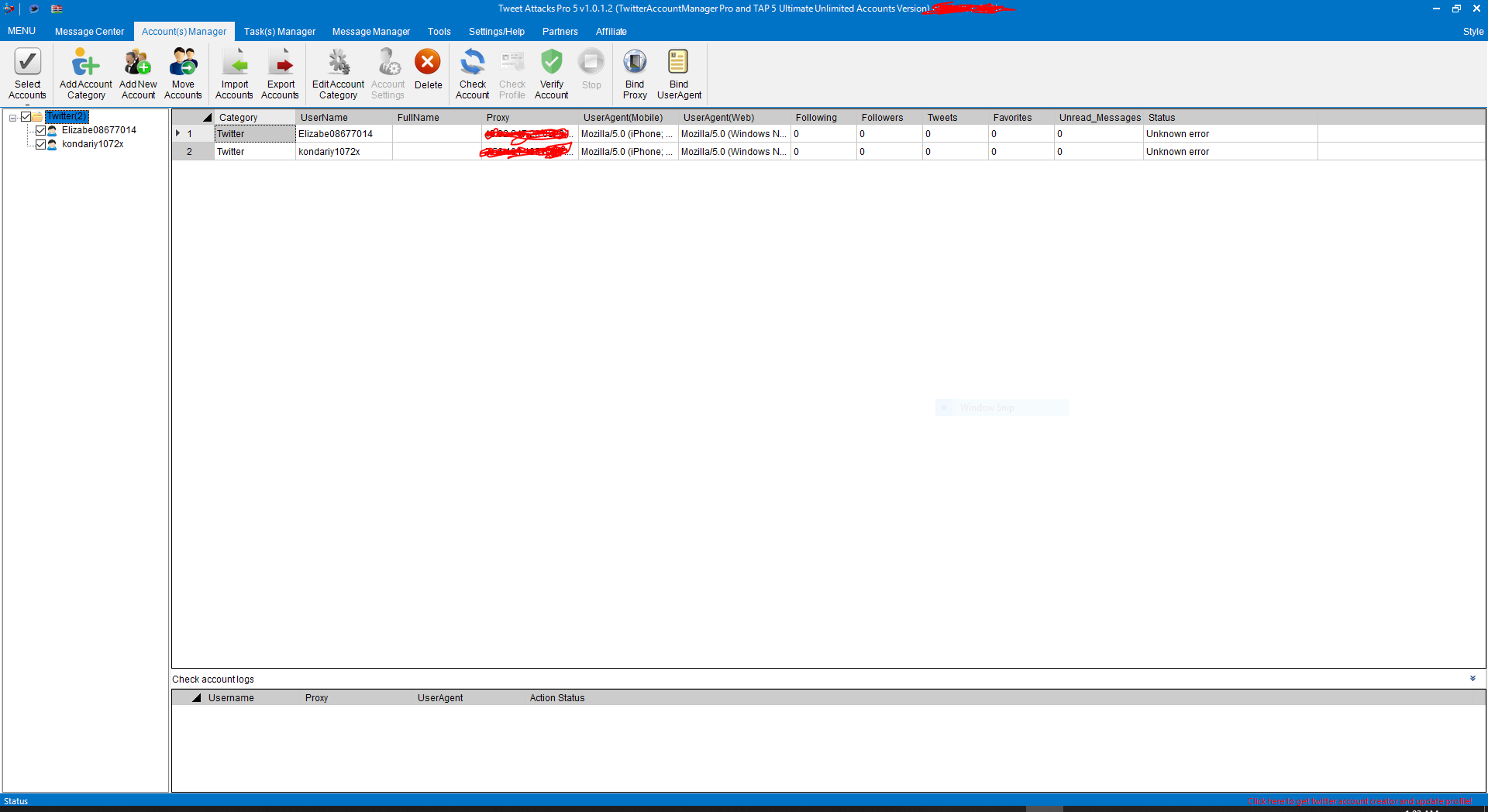 I bought the Ultimate Unlimited Accounts Version, TAP5. I bought 1,000 Proxies, 1,000 email addresses, 1,000 Twitter accounts, I made sure that all of these works fine. Still the software gives me Unknown Error everytime it tries to connect to the twitter accounts.