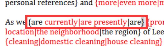 I have done a “Superspin” on an article andit did not do a very good job so I decided to add more synonyms inside thebrackets and removed some others that did not make sense. I did make sure thatthe pipes were in place but when I previewed the articles they were showing someof the the spintax (the brackets etc)