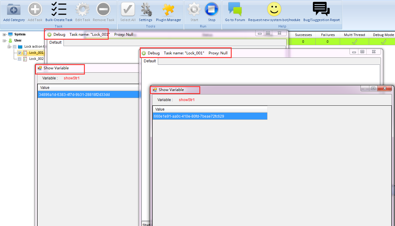 Use the same settings for task Lock_002. Check the screenshot, here two debug windows but only one show variable shown up. The reason is the Show variable action is below the Lock action, and each time only one thread can run. After this thread finished sucess, the next thread will run.