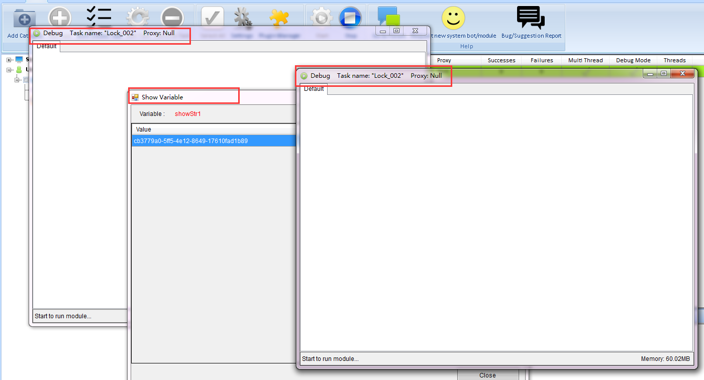 In order to show you a better presentation, here we will run the two sample modules (Lock_001, Lock_002) on BotChief Runner. Notice: module Lock_001 does not have the Lock action, module Lock_002 has the Lock action, and we put the Show Variable action below the Lock action.