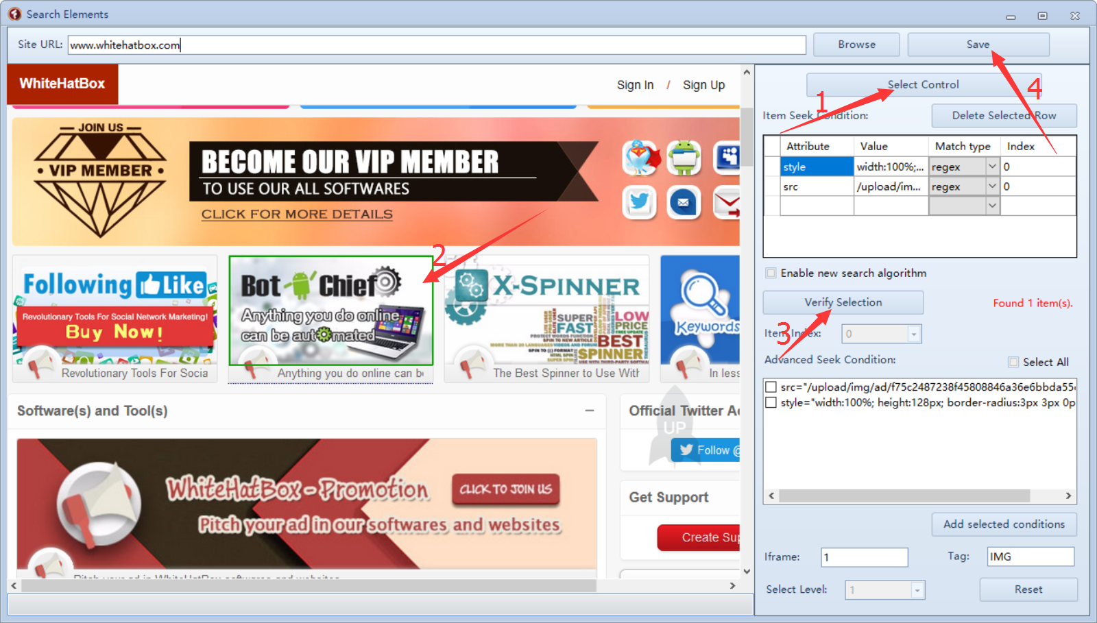 Verify Selection button to check if program found the Ads/Inner page link. If the color of the selected part turns green, that means program found it. See number 3 and 2.