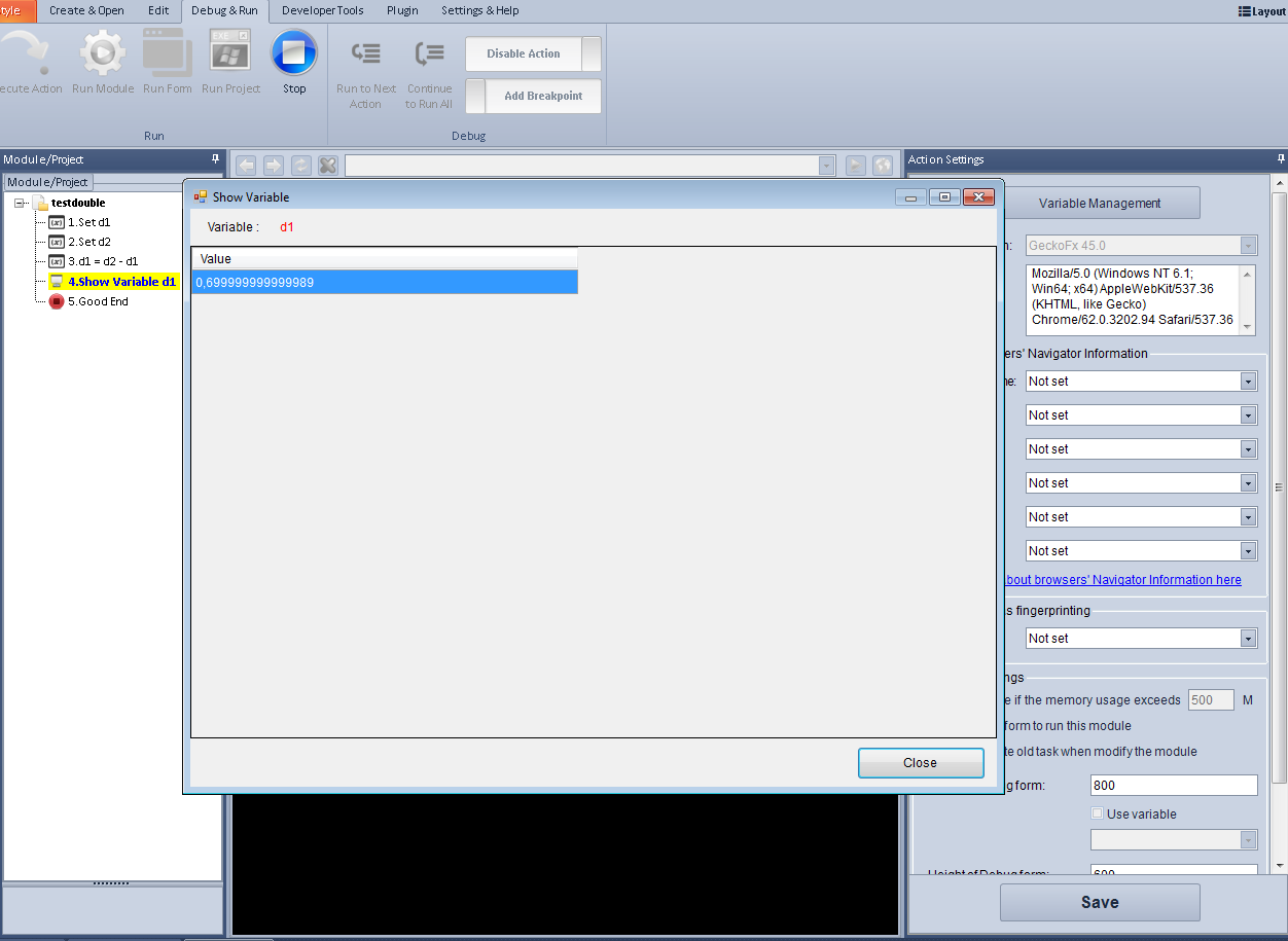 When working with variables that contain fractional values, I get strange results. I made a small test module, where the same situation.