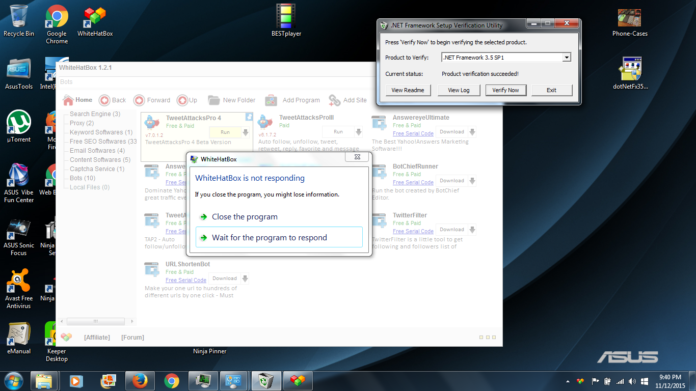 Whitehatbox app not responding after clicking on TweetAttack 3 and 4Whitehatbox installed on different partition net framework 3.5 enabled...